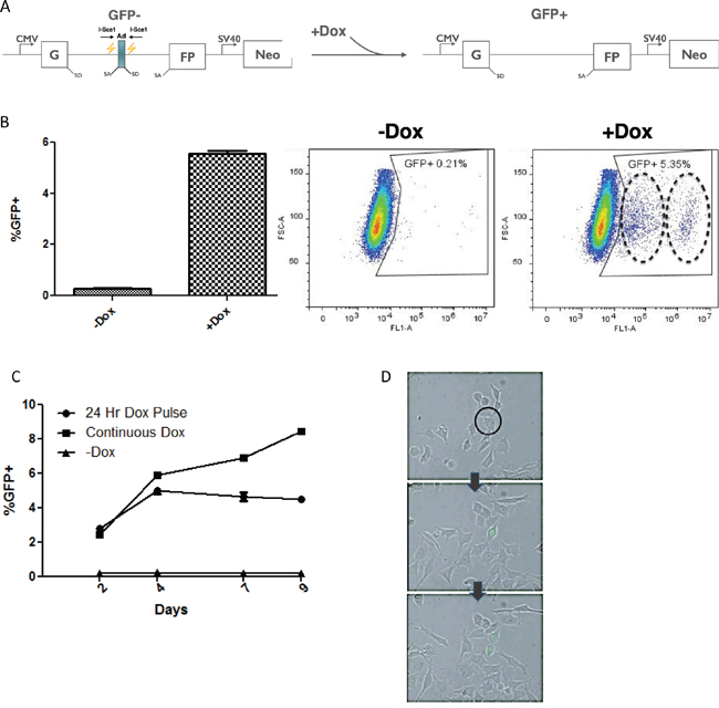 Figure 1: Doxycycline inducible construct uses GFP as a reporter for NHEJ. (A) Reporter construct integrated into the genome of the IHN20.22 HeLa cell line. The NHEJ reporter GFP gene contains a Pem1 intron interrupted by an adenoviral exon. Two I-Sce1 restriction sites allow the homing endonuclease to cut the DNA and excise the adenoviral exon to produce wild-type GFP following repair by NHEJ. (B) Generation of GFP positive cells following repair. Cells were induced with dox for 24 hours and then the percentage of the population expressing GFP was analyzed using FACS. The circles on the “+Dox” plot indicate two separate GFP positive cell populations with differing expression levels of GFP (C) Time course analysis. The percentage of GFP positive cells was analyzed by FACS over the course of 9 days, either following a 24-hour induction or with continuous exposure to doxycycline. The uncut cell line with no dox exposure was also analyzed to asses basal levels of GFP expression. (D) The onset of WT GFP expression in a single cell during the 72 hours following a 24 hour Dox induction was observed using live-cell imaging. The arrows indicate time progression and the black circle indicates the GFP negative cell that is GFP positive in subsequent images.