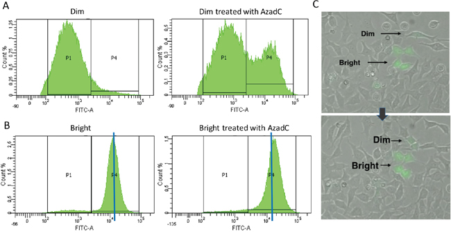 Figure 3: (A, B) Dim (A) and Bright (B) populations were sorted using FACS and then the sorted populations were treated with a daily dose of AzadC for 48 hours. The level of GFP expression was measured using FACS. The blue line in (B) indicates the median of the Bright peak. (C) Live cell imaging was used to observe the origination and propagation of cells with Dim and Bright expression of GFP during the 72 hours following a 24 hour dox induction. The arrow indicates the progression of time