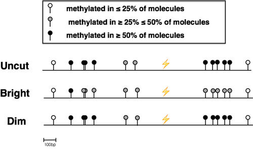 The availability of relatively pure populations of Dim and Bright cells makes it possible to use bisulfite DNA sequencing to interrogate methylation sites before and after NHEJ. Thus, in addition to validating the presence of epi-alleles in Dims and Brights, bisulfite DNA sequencing of the post-repair populations makes it possible to map these epi-alleles relative to the I-Sce1 cleavage and repair site. Bisulfite sequencing confirmed that the GFP gene is hypomethylated in sorted Bright cells and hypermethylated in sorted Dim cells. Specifically, changes occur in regions both up and downstream of the break site (Figure 4). Interestingly, the methylation status of CpGs in the region directly flanking the break site is not affected by the process. This suggests a coordination of methylation and repair proteins to affect methylation patterns in specific areas around the site of DNA damage.