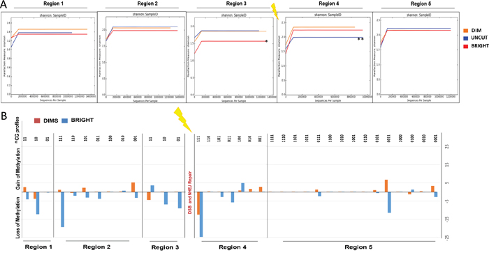 Figure 6: Regions adjacent to DSB give discriminate REC from UNCUT and BRIGHT from DIMS. Epiallelesprofiles obtained from the analysis of the methylation of each amplicons were subjected to alpha and beta diversity (Qiime). (A) Shannon diversity index between BRIGHT, DIMS and UNCUT. In the X and Y axes are represented, respectively, “number of sequences for sample” and “Rarefaction measure (species richness)” for Shannon Index. (B) Gain or loss of methylation in BRIGHT and DIMS compared to the UNCUT.