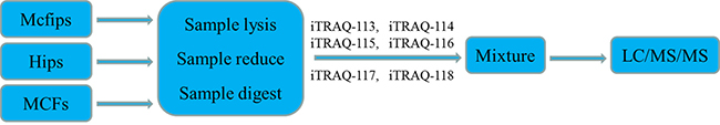 Labeling of samples with iTRAQ and Strong Cation Exchange chromatography (SCX) methods were as previously described [15, 16]. Briefly, the protein samples of Mcfips, MCFs and Hips were reconstituted in dissolution buffer, denatured, reduced, alkylated and then trypsinized. The supernatants were collected, and the total protein concentration was determined using a Bradford protein assay kit. In our study, tryptic digests of Mcfips samples were labeled with 115 and 116 iTRAQ reagents while MCFs samples with 113 and 114 iTRAQ reagents, and Hips samples with 117 and 118 iTRAQ reagents. All samples were balanced, mixed, and were pre-separated using SCX chromatography as described earlier [17, 18]. Then fractions were collected and subjected to LC- mass spectrometer (MS)/MS analysis.