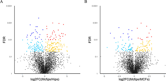 Figure 2: Volcano plot of proteins expressed in the Mcfips comparing to MCFs and Hips, respectively. The X-axis represents log2-fold change of high- (positive values) and low-expressed (negative values) proteins in (A) Mcfips comparing in comparison to Hips, (B) Mcfips comparing in comparison to MCFs. The Y-axis corresponds to the false discovery rate (FDR) of this fold change. Blue inverted triangle: low-expressed protein with FDR < 0.01; green inverted triangle: low-expressed protein with FDR < 0.05; black spot: no significant differential protein; red triangle: high-expressed protein with FDR < 0.01; yellow triangle: high-expressed protein with FDR < 0.05.