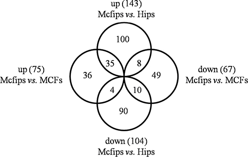 Figure 3: Venn-Euler diagrams of differentially expressed proteins in Mcfips comparing to Hips and MCFs.