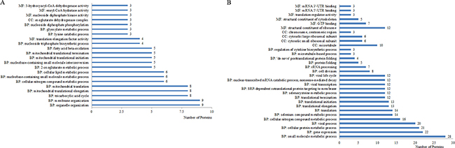 Figure 4: Up- (A) and down-regulated proteins (B) categorized by biological process (BP), molecular function (MF), and cellular component (CC) in Mcfips comparing to Hips.