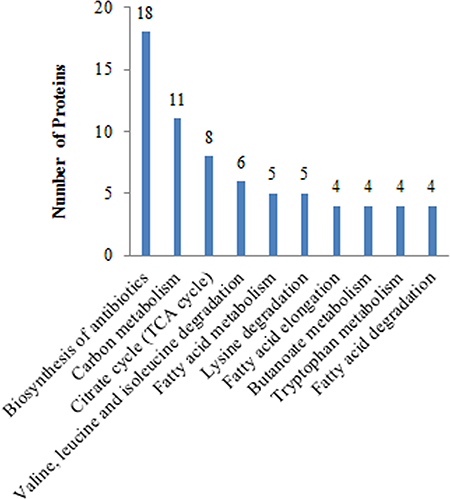 In the comparison group of Mcfips and Hips, the proteins with increased expression representing BPs included organelle (6%), membrane organization (6%), tricarboxylic acid cycle (5%), mitochondrial translational elongation (5%), mitochondrial translation (5%), and etc.. The MFs categories were translation elongation factor activity (3%), nucleoside diphosphate kinase activity (2%), enoyl-CoA hydratase activity (2%), and 3-hydroxyacyl-CoA dehydrogenase activity (2%). The proteins representing CCs were classified as oxoglutarate dehydrogenase complex (2%) (Figure 4A). The proteins with decreased expression were categorized as BPs, MFs, and CCs according to the GO database. Top five BP proteins represented small molecule metabolic process (25%), gene expression (20%), cellular protein metabolic process (19%), viral process (18%), and cellular nitrogen compound metabolic process (14%). Top three MFs proteins were also classified into the categories included structural constituent of ribosome (11%), GTP binding (6%), and structural constituent of cytoskeleton (4%). Identified CC proteins were classified as belonging to the microtubule (9%), cytosolic small ribosomal subunit (5%), cytosolic large ribosomal subunit (5%) and chromosome, centromeric region (3%) (Figure 4B). The DE proteins were further defined based on KEGG. The proteins were mapped to KEGG pathways based on their KEGG gene ID. The DE proteins for up- and down-regulated were involved in ten and three KEGG pathways, respectively. For up-regulated proteins, the top two significant (P < 0.05) pathways were Biosynthesis of antibiotics and Carbon metabolism (Figure 5). The two significant (P < 0.05) pathways for down-regulated proteins were Pathogenic Escherichia coli infection and Gap junction.