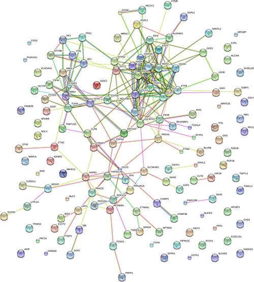 Figure 6: Interactome network of up-expressed proteins in Mcfips comparing to Hips. Coloured lines represent different evidences for each interaction: red line, fusion; green line, neighbourhood; blue line, cooccurrence; purple line, experimental; yellow line, text mining; light blue line, database; black line, coexpression.
