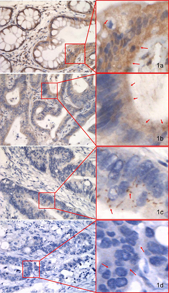 A MiniCore® tissue arrayer (Alphelys, France) was used to construct the tissue microarray [18]. Hematoxylin and eosin-stained slides of all formalin-fixed paraffin-embedded specimens were examined by the experienced pathologists Huang Y and Fan XJ, who selected areas containing CRC, CA, or NCM while avoiding areas of necrosis, inflammation, and keratinization. To assess reproducibility, we selected two cores from different areas of a single specimen. The tissue microarray construction procedure used here has been described elsewhere [18]. Briefly, tissue cylinders 1.0 mm in diameter were punched from representative tissue areas and embedded in single paraffin blocks (2.6 cm × 2.2 cm). Serial sections (4.0 μm) were cut from these blocks with a microtome and mounted on APES-coated slides for IHC analysis.
