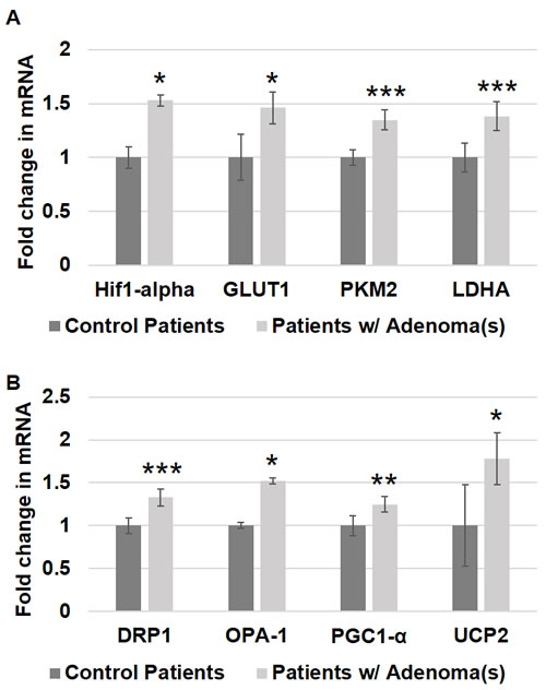 Figure 1: Metabolic and mitochondrial changes in patient rectal biopsies from uninvolved mucosa. Messenger RNA (mRNA) expression of A. metabolic markers - HIF1α, GLUT-1, PKM2 and LDHA and B. mitochondrial markers - DRP1, OPA-1, PGC1-α and UCP2 was measured in rectal uninvolved mucosal biopsies collected from patients with (n = 38) or without (n = 43) any adenomas. The error bar represents standard error of mean (SEM). Statistical significance is denoted as * = p < 0.05; ** = p < 0.01; *** = p < 0.001.