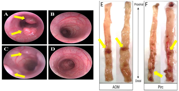 Figure 2: Representative animal model images showing colonoscopy and tumors. A.-D. Colonoscopy images from animals with tumors and control animals; E. AOM-induced tumor images and F. PIRC rat tumor images in the colon.