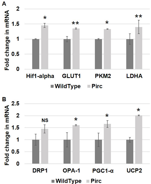 Figure 3: Metabolic and mitochondrial changes in PIRC rat model. Messenger RNA (mRNA) expression of A. metabolic markers - HIF1α, GLUT-1, PKM2 and LDHA and B. mitochondrial markers - DRP1, OPA-1, PGC1-α and UCP2 was measured in rectal uninvolved mucosal biopsies collected from PIRC rats with tumors (n = 6) or age-matched control rats (n = 6). The error bar represents standard error of mean (SEM). Statistical significance is denoted as * = p < 0.05; ** = p < 0.01; *** = p < 0.001.
