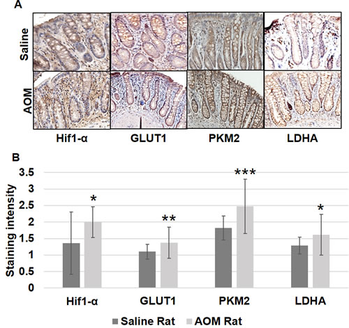 Figure 5: Metabolic changes in uninvolved mucosa by IHC in AOM model. Expression of HIF1α, GLUT-1, PKM2 and LDHA by immunohistochemical staining was performed as described in Materials and Methods Section. Ten optical fields from each specimen were scored (0-3; with 0 being no intensity and 3 very strong). The error bar represents standard error of mean (SEM). Statistical significance is denoted as * = p < 0.05; ** = p < 0.01; *** = p < 0.001.