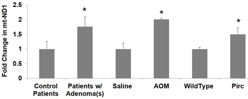 Mitochondria contain multiple copies of mtDNA (2-10 each), and increasing the mtDNA copy number can help compensate for the presence of mtDNA mutations. Studies have shown that CRC tumors have increased mtDNA copy number, and epidemiological studies have also demonstrated a significant association between mtDNA copy number and CRC risk [21, 36]. In order to investigate changes in mitochondrial DNA copy number in early premalignant CRC field carcinogenesis, we quantified expression of the mitochondrial gene mtND1 and normalized this to the expression of the nuclear gene 18S in patient rectal biopsies. Patients harboring precancerous lesions showed 1.76 fold increase in mtND1 expression p < 0.05 in their rectal mucosa compared to patients without precancerous lesions (Figure 6). Pirc rats harboring adenomas/tumors had increased mtDNA copy number (1.50 fold increase in mtND1, p < 0.05). Rats injected with AOM had increased mtDNA copy number (2.01 fold increase in mtND1, p < 0.02) (Figure 6).