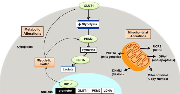 Further studies are needed to elucidate the specific mechanisms underlying these metabolic and mitochondrial changes. Our data suggest that an early increase in HIF1α expression in the colorectal field induces increased aerobic glycolysis in the pre-malignant colorectal field. Increased HIF1α may also induce an increase in mitochondrial fission via promotion of DRP1, resulting in lower OXPHOS capacity. This underlying cause of this early increase in HIF1α may be related to increased oxidative stress in the colorectal field since increased mitochondrial ROS is known to increase HIF1α levels [38]. Increased mitochondrial ROS likely induces an increase in UCP2, which may function to prevent excess accumulation of ROS, promote retrograde mitochondrial signaling and/or reduce ATP generation via OXPHOS. Oxidative stress is also known to increase mitochondrial mass, which may be the reason we observe an increase in PGC1-α. These metabolic and signaling pathways are complex, however, and the underlying mechanism needs to be clarified in future studies. It is important to note that these changes in metabolism and mitochondria occur early in CRC carcinogenesis and precede the development of pre-cancerous lesions. This suggests that they provide a microenvironment in the colorectal field that promotes carcinogenesis.