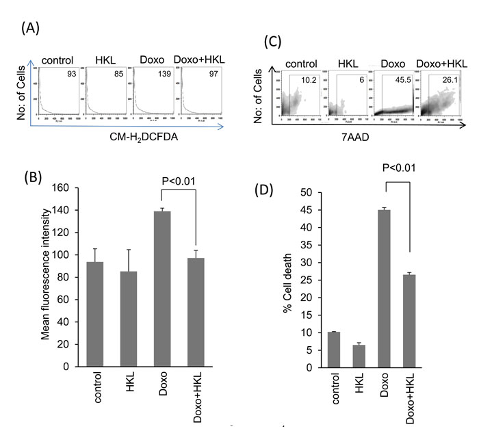 Figure 1: HKL treatment protects cardiomyocytes from doxorubicin-mediated injury. A. Primary cultures of cardiomyocytes were treated with 10μM HKL for 24 hours in the presence or absence of 2μM doxorubicin. Cells were stained with CM-H2DCFDA and ROS levels were measured by fluorescence-activated cell sorter. B. Quantification of mean fluorescence intensity (MFI) in different groups of cells. Values are average of four independent experiments, Mean ± SE. C. Primary cultures of cardiomyocytes were treated with 10μM HKL for 24 hours in the presence or absence of 5uM doxorubicin. Extent of apoptosis was measured by estimating the percentage of 7AAD positive cells by FACS analysis. (D) Quantification of cell death in different groups of cells. Values are average of five independent experiments, Mean ± SE.
