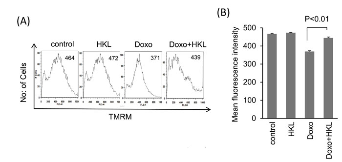 Figure 2: HKL preserves mitochondrial membrane potential. A. Cardiomyocytes were treated with 2μM doxorubicin for 24-hours in the presence or absence of 10μM HKL. Cells were stained with TMRM and mitochondrial dye incorporation was measured by FACS analysis. B. Quantification of MFI of TMRM staining in different groups of cells. Values are average of three independent experiments, Mean ± SE.