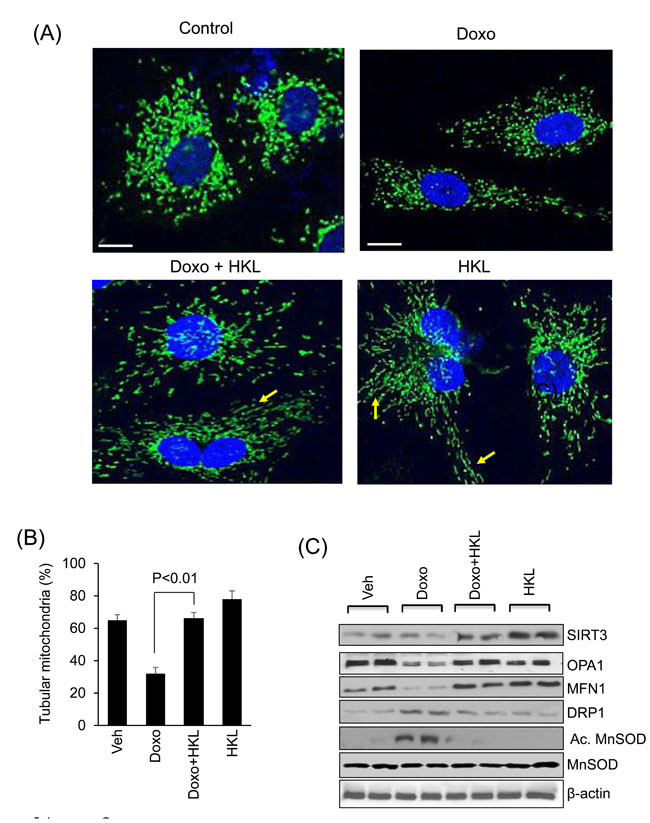 Excessive ROS production is associated with oxidation of cellular macromolecules leading to cell death. SIRT3 can block cardiomyocyte apoptosis by activating many different defense mechanisms. Translocation of the protein Bax into the mitochondria causes apoptosis. Deacetylation of Ku70 by SIRT3 augments its interaction with the pro-apoptotic Bax and prevents its translocation to mitochondria [56]. Another process that influences apoptosis is mitochondrial dynamics. Constant mitochondrial fusion and fission permits the exchange of mitochondrial contents and Ca2+ signal transmission [39]. Hence, dysregulation of mitochondrial dynamics is detrimental to the cell. DRP1 is a master regulator of mitochondrial fission, and over activation of DRP1 is associated with mitochondrial fragmentation and cell death [57]. In contrast, MFN1 and OPA1 are proteins involved in outer and inner mitochondrial membrane fusion, respectively. SIRT3 mediated activation of OPA1 has been shown to protect cardiomyocyte from cell death [31]. In agreement with these findings, we found that doxorubicin treatment reduced protein levels of OPA1 and MFN1, while increasing the expression of DRP1. HKL treatment helped to maintain these protein levels at normal levels suggesting that HKL can improve the health of mitochondria by promoting mitochondrial fusion. Correspondingly, overexpression of SIRT3 also protects cardiomyocytes from Doxo-induced cell death [29]. Consistent with these observations, in this study, here we found that treatment with HKL efficiently blocks Doxo-induced cardiomyocyte cell death.