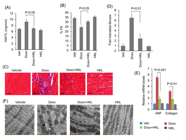 Figure 4: HKL treated mice are protected from doxorubicin-induced cardiac damage. A. Heart weight to tibia length (HW/TL) ratio of vehicle (Veh), Doxo, Doxo plus HKL and HKL alone treated mice. Values are mean ± SE, n = 8-10. B. Echocardiographic measurements of fractional shortening in Veh, Doxo, Doxo plus HKL and HKL alone group of mice. Values are mean ± SE, n = 8-10. C. Representative sections of hearts stained with Masson’s trichrome to detect fibrosis (blue); scale bars, 20 µm. D. Quantification of cardiac fibrosis in different groups of mice. Mean ± SE, n = 5. E. Expression levels of collagen-1 and ANF mRNA levels in different groups of mice, mean ± SE, n=6 mice. F. Representative electron microscopy images of the heart from Veh, Doxo, Doxo plus HKL and HKL alone treated mice. Scale bar 2µM.