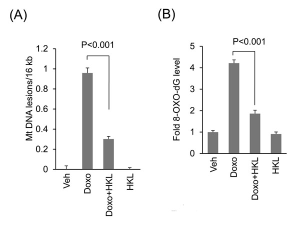 Figure 6: HKL treatment protects cardiomyocytes from doxorubicin-induced mitochondrial damage in vitro. A. Primary cultures of cardiomyocytes were treated with 2μM doxorubicin in the presence or absence of 10μM HKL for 24 hours. mtDNA damage was assessed by quantitative PCR analysis. Mean ± SE, values are average of three independent experiments. B. Primary cultures of cardiomyocytes were treated with 10μM HKL for 24 hours in the presence or absence of 2μM doxorubicin and 8-oxo-dG content in total DNA was measured. Mean ± SE, values are average of three independent experiments.