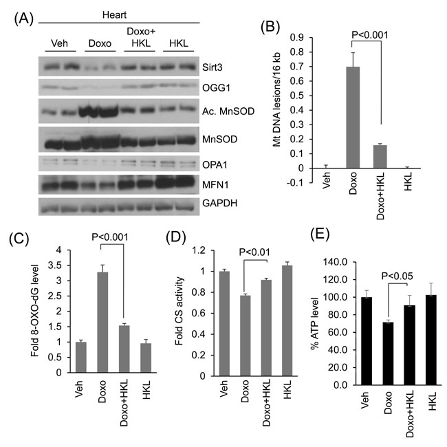 Figure 7: HKL treatment protects the heart from doxorubicin-induced mitochondrial damage in vivo. A. Heart lysates of Vehicle, Doxo, Doxo plus HKL and HKL alone treated mice were subjected to immunoblotting using indicated antibodies. Representative blot of two different mice in each group are shown, n = 6. (quantification of blots is given in supplement Figure 2). B. Mitochondrial DNA damage was assessed in the whole heart of different group of mice as in panel A. All values are mean ± SE, n = 6. C. 8-Oxo-dG content in the DNA of whole heart of different group of mice. All values are mean ± SE, n = 5. D. Mitochondrial citrate synthase activity in the heart of different group of mice. CS, citrate synthase. Values are mean ± SE, n = 5. E. quantification of ATP contents in the heart lysate of different groups of mice as in panel A. Values are mean ± SE, n = 5.