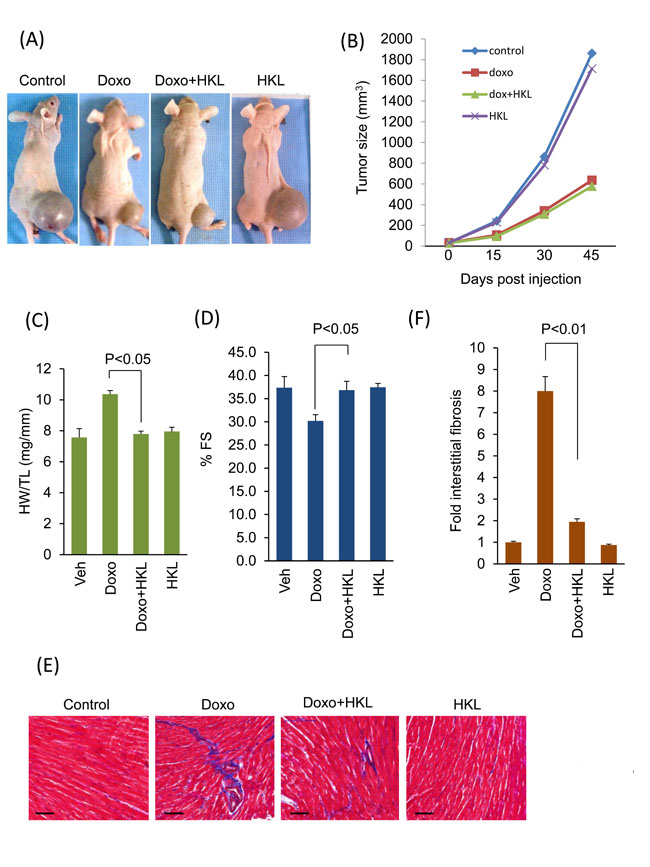 Next, we sought to investigate whether treatment with HKL has any effect on the anti-tumor potency of doxorubicin. PC3 tumor cells were implanted subcutaneously in the flank of nude mice. Mice received first dose of doxorubicin seven days after tumor cell implantation. Two more doses of doxorubicin were given at 15-day intervals. HKL treatment was started one day before doxorubicin infusion. Mice treated with doxorubicin showed significant reduction in tumor volume as compared to controls. Similar reduction in tumor volume was observed in mice that were concomitantly treated with doxorubicin and HKL (Figure 8A and 8B). Similar to our earlier results, doxorubicin induced cardiac hypertrophy associated with reduced cardiac functions, but not when mice were treated with HKL during doxorubicin infusion (Figure 8C and 8D). Furthermore, doxorubicin plus HKL treatment also reduced cardiac fibrosis, suggesting that HKL can effectively block doxorubicin- induced cardiac hypertrophy without compromising the tumor killing potential of doxorubicin (Figure 8E and 8F).