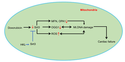 In summary, our results suggest that doxorubicin-induced toxicity to the heart is associated with reduced SIRT3 levels. HKL, an activator of SIRT3 can mitigate Doxo-induced cardiotoxicity by maintaining SIRT3 levels, and attenuating Doxo-induced mtDNA damage. Based on our results we believe that HKL has the potential to protect the heart from Doxo-induced toxicity without compromising its chemotherapeutic potential.