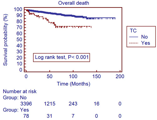 Figure 4: Overall survival in 3,490 clear cell type renal cell carcinoma patients with and without thrombocytosis (Kaplan-Meier plot); TC, thrombocytosis.