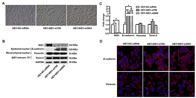 Figure 3: NID1 silencing in HEY cells induced partial MET process. (A) Representative microscopic views of HEY-NC-siRNA, HEY-NID1-si798 and HEY-NID1-si2983 cells (200×magnification). (B) Western blot for NID1, E-cadherin, Vimentin and Twist-2 in the indicated cells, with GAPDH as the loading control. (C) Quantitative RT-PCR for NID1, E-cadherin, Vimentin and Twist-2 in the indicated cells, with GAPDH as the quantitative control. Two independent experiments were performed in triplicates (Two-sided independent Student’s t test, *P<0.05, **P<0.01). (D) Immunofluorescent microscopic images of E-cadherin (red) and Vimentin (red) and in the indicated cells. Nuclear was stained with 4,6-diamidino-2-phenylindole (blue) (scale bar = 20 μm).
