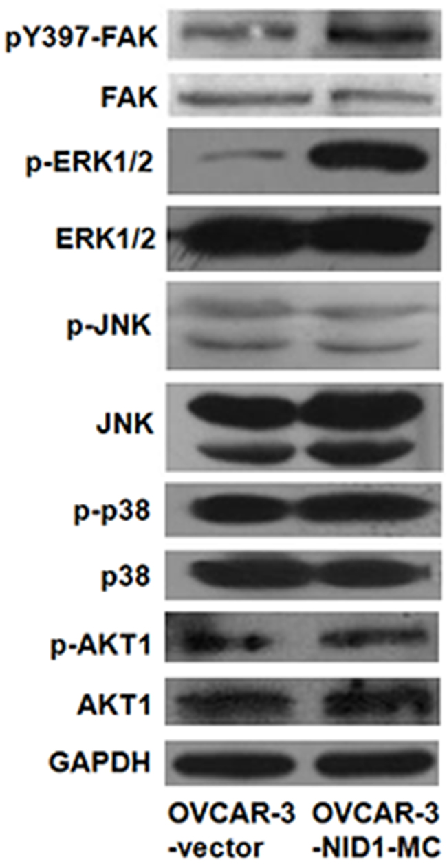 Figure 4: Effect of NID1 on signaling pathways. Western blot for FAK, ERK1/2, JUK, p38 and AKT1 and their corresponding activation in total cell lysates of OVCAR-3-vector and OVCAR-3-NID1-MC cells. GAPDH served as an internal control of protein loading.