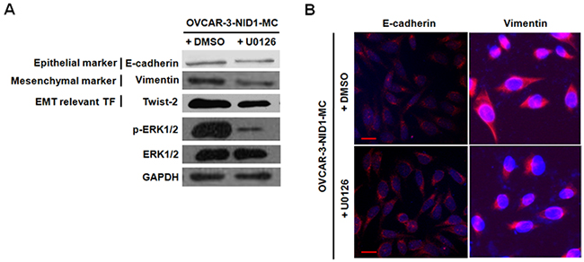 Figure 5: The NID1-induced expression of EMT relevant markers was regressed in the presence of U0126 (a MEK1 inhibitor). (A) Western blot for E-cadherin, Vimentin, Twist-2, phoshpo-ERK1/2 and total ERK1/2 in total cell lysates of OVCAR-3-NID1-MC cells after U0126 treatment. GAPDH served as an internal control of protein loading. (B) Immunofluorescent microscopic images of E-cadherin (red) and Vimentin (red) in OVCAR-3-NID1-MC cells after U0126 treatment. Nuclear was stained with 4,6-diamidino-2-phenylindole (blue) (scale bar = 20 μm).