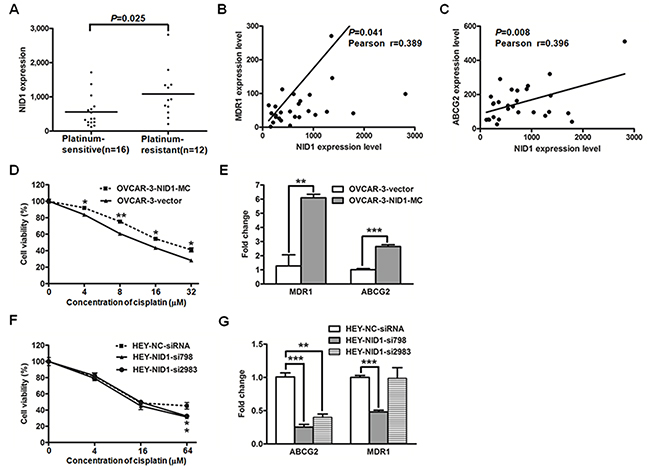 Figure 8: The gene expression datasets of 28 high-grade serous ovarian cancer tissue processed by 2log normalization was extracted from the Koti group (GSE51373). NID1 expression level was indicated in the platinum-sensitive group and the platinum-resistant group (A) Correlations between the expression levels of NID1 and MDR1 (B) or ABCG2 (C) were evaluated with the Pearson correlation test. (D) The cell viability of OVCAR-3-vector and OVCAR-3-NID1-MC cells treated with various concentrations of cisplatin was measured by CCK-8 assay. (E) Quantitative RT-PCR for MDR1 and ABCG2 in the indicated cells, with GAPDH as the quantitative control. (F) The cell viability of HEY-NC-siRNA, HEY-NID1-si798 and HEY-NID1-si2983 cells treated with various concentrations of cisplatin was measured by CCK-8 assay. (G) Quantitative RTPCR for MDR1 and ABCG2 in the indicated cells, with GAPDH as the quantitative control. Three independent experiments were performed in triplicates. Statistical analysis was done using twosided independent Student’s t test. *P<0.05, **P<0.01, ***P<0.001.
