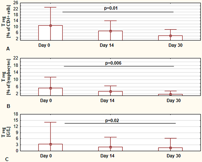 Figure 3: Influence of ibrutinib therapy on Treg cells (CD4+CD25highFoxP3+ crlls). The percentage of CD4+CD25highFoxP3+ T cells calculated in regards to lymphocytes population at day 0, day 14, and day 30 of treatment, respectively (A) The percentage of CD4+CD25highFoxP3+ T cells calculated in regards to CD4+ lymphocytes population at day 0, day 14, and day 30 of treatment, respectively (B)The number of CD4+CD25highFoxP3+ T cells at day 0, day 14, and day 30 of treatment, respectively (C) The presented graphs show the mean ± standard deviation of results obtained from the group of analyzed patients (n=19). The p values are indicated.
