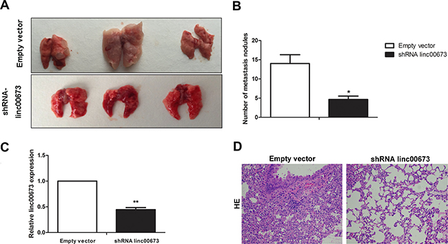 Figure 2: The effect of linc00673 on NSCLC metastasis in vivo. (A, B) SPC-A1 cells were stably transfected with empty vector or shRNA lin00673 and injected into male nude mice via the tail vein as described in the Materials and Methods Section. Lungs were removed from the mice and metastatic nodules counted. (C) linc00673 expression levels in lungs of shRNA linc00673 or empty vector transfected SPC-A1 cells on qRT-PCR. (D) Representative images (×200) of HE staining. The data represent the mean ± s.d. of three independent experiments. *P < 0.05, **P < 0.01.