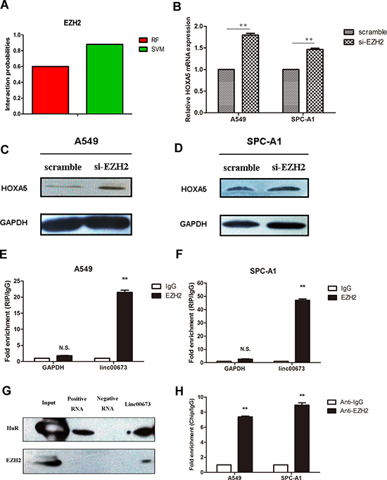 Figure 4: Binding of linc00673 to EZH2 repressed HOXA5 transcription. (A) The interaction probability of linc00673 with Enhancer of Zeste Homolog 2 (EZH2) was predicted by RNA-Protein interaction prediction website (http://pridb.gdcb.iastate.edu/RPISeq/). (B, C and D) mRNA and protein changes of HOXA5 in A549 and SPC-A1 when transfected with siRNA-EZH2 on qRT-PCR and Western blot. (E, F) RNA binding protein immunoprecipitation (RIP) assay with rabbit monoclonal anti-EZH2 and preimmune IgG from A549 and SPC-A1 cell extracts. Expression levels of linc00673 RNA were presented as fold enrichment in EZH2 relative to IgG immunoprecipitates on qRT-PCR analysis. (G) Western blot analysis showed that linc00673 could pull down the EZH2 protein. HuR protein acted as a positive control. (H) ChIP of EZH2 occupancy in the NCALD promoter in A549 cells. The data represent the mean ± s.d. of three independent experiments. *P < 0.05, **P < 0.01.