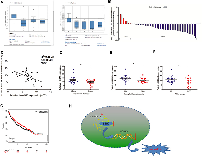 Figure 6: The expression pattern and clinical significance of HOXA5 in NSCLC. (A) Two microarray datasets from Garber and Bhattacharjee lung cancer cohorts on Oncomine website exhibited the HOXA5 mRNA levels in lung cancer tissues. (B) HOXA5 mRNA expression levels in NSCLC tissues on qRT-PCR analysis. (C) Correlation of linc00673 and HOXA5 mRNA expression levels in 30 NSCLC tissues (ΔCT value). (D, E and F) Correlations of HOXA5 expression with clinicopathological parameters. (G) Kaplan–Meier survival plots indicated a positive relationship between HOXA5 and overall survival (n = 1432). (H) Summary diagram describes that linc00673 and HOXA5 regulates NSCLC cell metastasis. *P < 0.05, **P < 0.01.