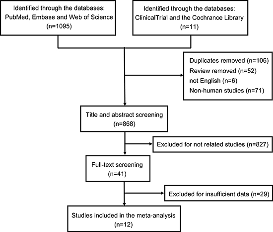 A total of 1,106 papers were identified by the systematic literature search, where 106 duplicates, 52 reviews, 6 non-English, and 71 non-human studies were excluded and removed, resulting in 868 papers. Further, 856 articles were removed due to relevance, design, and outcome data through the title, abstract, and full-text screening (Figure 2). Ultimately, 12 papers were incorporated into the meta-analysis.