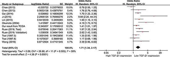 In summary, both data mining results from the TCGA database and meta-analysis results from published studies definitively presented a negative prognostic effect of high TGF-β1 expression on the OS in HCC patients. Our results may provide an insight for the prognostic prediction of HCC patients. Further preclinical and clinical research with larger samples and open individual data of patients are required to validate the prognostic significance of TGF-β1 expression in HCC patients.