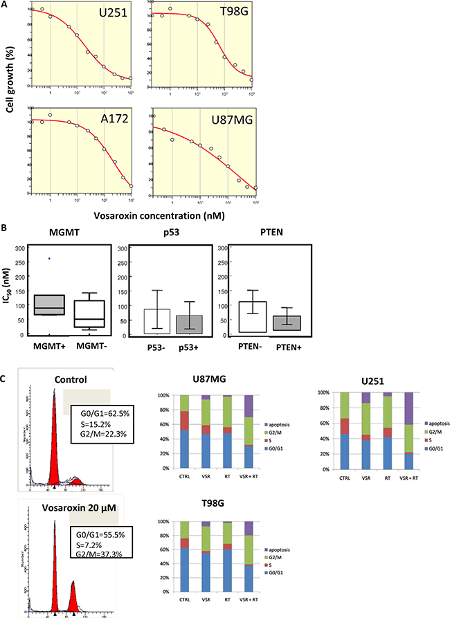 Figure 2: Effects of vosaroxin on glioma cell lines. (A) Growth inhibition curves for U251, T98G, A172, and U87MG glioma cell lines treated with vosaroxin, generated with Grafit software. (B) No statistically significant differences were found in the IC50 of vosaroxin in glioma cell lines by MGMT, p53, or PTEN status. (C) Cell cycle analysis of vosaroxin-induced G2/M cell cycle arrest (left panels), and combination effects of vosaroxin (20 nM) and radiotherapy on cell cycle arrest and apoptosis in U87MG, U251 and T98G cells (bar graphs in right panels).