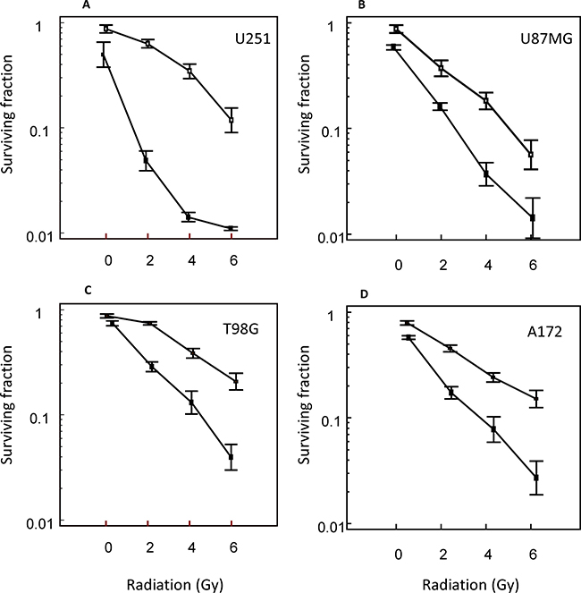 Figure 3: Radiosensitizing effects of vosaroxin on glioma cell lines. Clonogenic curves for (A) U251, (B) U87MG, (C) T98G, and (D) A172 cells treated with vosaroxin (solid line) and control (no vosaroxin; dashed line).