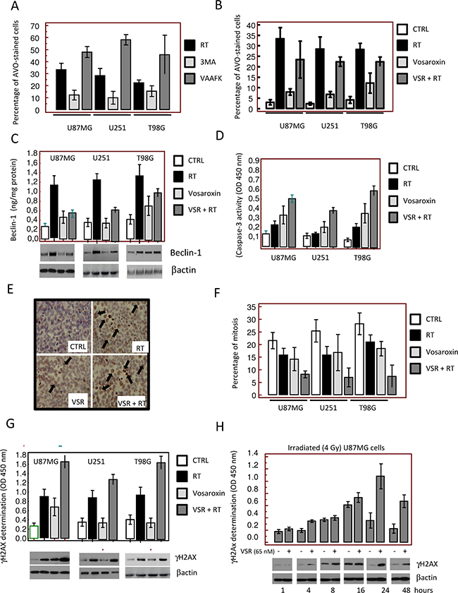 Figure 4: Molecular and cytologic analyses of the mechanisms of radiosensitization by vosaroxin. To define the molecular mechanisms involved in radiosensitization by vosaroxin we treated cells with radiotherapy (RT; at 2, 4, and 6 Gy) and vosaroxin at concentrations equal to IC20 values (15 nM for U251, 65 nM for U87MG, and 45 nM for T98G cells). (A) Percentage of acidic vesicular organelle (AVO)-stained glioma cells 24 hours after RT treatment (4 Gy). Percentage of AVO-stained cells was increased by the pan-caspase inhibitor z-Val-Ala-Asp(Ome)-fluoromethyl ketone (VAAFK, 10 μM) and was reduced by the autophagy inhibitor 3-methyladenine (3MA, 5 μM). (B) Percentage of AVO-stained cells after treatment with RT, vosaroxin (VSR), or the combination. CTRL: control. (C) Modulation of expression of an autophagy marker, beclin-1, by RT, vosaroxin, and combination vosaroxin plus RT by Western blot and ELISA. (D) Caspase-3 activity in treated and control cell cultures. (E) Immunocytochemical appearance of γH2Ax expression in T98G cultures after RT, vosaroxin, and combination RT plus vosaroxin for 24 hours. (F) Percentage of mitosis in U87MG, U251, and T98G cultures after single-agent or combination treatment. (G) γH2Ax expression in U87MG, U251, and T98G cells at 24 hours of treatment. (H) Expression of γH2Ax by ELISA and Western blotting measured in U87MG cells at 1, 4, 8, 16, 24, and 48 hours after 4 Gy irradiation with or without vosaroxin pre-treatment.
