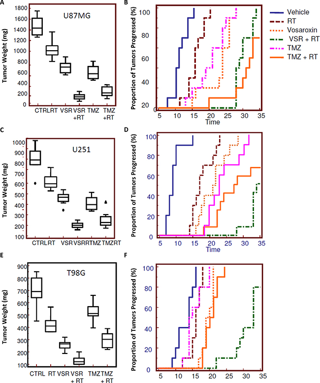 Figure 5: Radiosensitizing effects of vosaroxin on tumor weight and time to progression in xenograft models. To assess the effect on tumors in an in vivo model, 1 × 106 cells of U251, U87MG, and T98G GBM cells were subcutaneously injected in female cd1 nu/nu mice. When tumors reached a volume of 80 mm3 (about 10 days after cell injection), animals were randomized to receive radiotherapy (RT) alone (1 single dose of 4 Gy), vosaroxin (VSR; 10 mg/kg q 5 d for 5 wk), or vosaroxin (10 mg/kg q 5 d for 5 wk) plus RT (1 single dose of 4 Gy administered after 3 days of vosaroxin treatment). These treatments were compared with standard therapies consisting of temozolomide (TMZ; 16 mg/kg ´ 5 consecutive days) and temozolomide plus RT. Changes in tumor volumes were measured over time. After 35 days, animals were sacrificed and tumors harvested and weighed. Final tumor weights (at day 35) and Kaplan-Meier analysis of time to progression are shown for: (A, B) U87MG; (C, D) U251; and (E, F) T98G xenograft models. CTRL: control.