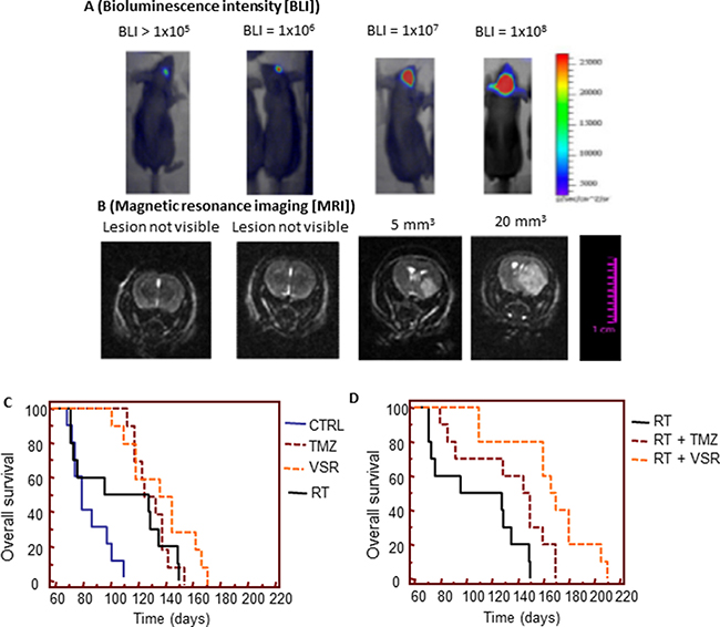 Orthotopic luciferase-transfected U251 tumor growth and therapy studies were conducted with an approved animal-use protocol. Nude mice were inoculated intracerebrally [64] as follows: animals were anesthetized with 100 mg/kg ketamine, 15 mg/kg xylazine, and 0.05 mL atropine intramuscularly; the surgical zone was swabbed with Betadine solution and the eyes coated with Lacri-lube; the head was fixed in a stereotactic frame (mouse stereotaxics instrument, Stoelting Europe, Dublin, Ireland) and a midline scalp incision was made; a small hole was made at 1.0 mm anterior and 2 mm lateral to the exposed bregma; a sterile 5 μL Hamilton syringe with a 26-gauge needle was inserted at a depth of 3.0 mm from the skull surface and withdrawn by 0.5 mm to inject 3 × 103 U87MG cells in a volume of 3 μL at an injection up to 1 μL/min. After the implantation of the tumor cells, the needle was left in place for 5 minutes to prevent reflux. The needle was then completely withdrawn from the brain over the course of 4 minutes (1.0 mm/min) and the skin was sutured. Just before treatment initiation (5 days after injection), animals were randomized to treatment groups of 10 mice each. In vivo bioluminescence images were obtained using a Hamamatsu camera (Hamamatsu Photonics Italy S.R.L, Arese, Italy) to identify intracranial implants similar to the method described by Kemper et al. [65]. Animals were anesthetized and luciferin (150 mg/kg) was injected intraperitoneally 15 minutes prior to imaging. The mice were photographed while placed on their front and the bioluminescence intensity (BLI) was measured in the region of interest. The BLI value just prior to the initiation of the treatment was used to calculate the %BLI of increment for each individual animal. We deliberately inoculated a small number of cells (3 × 103) to simulate a chemo-radiotherapeutic treatment made after surgery in which a low number of tumor cells, remaining in the operatory bed, regrows and gives rise to a recurrence as described previously [62]. Treatments were started 5 days after cell injection when no luciferase activity was intracranially detectable. Tumor growth delay (recurrence time equivalent of DFS) was evaluated by assessment of intracranial luciferase activity by BLI, and also by magnetic resonance imaging (MRI) [66]. BLI photon counts and tumor volumes from MRI were correlated. Mice were euthanized when they displayed neurological signs (eg, altered gait, tremors/seizures, lethargy) or weight loss of 20% or greater of presurgical weight and OS was recorded.