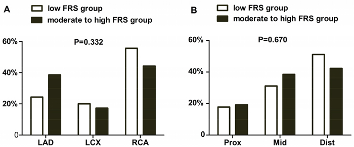 Baseline angiographic characteristics are showed in Table 2. The lesion distribution of the 2 groups in the 3 coronary arteries (LAD, LCX and RCA) was not significantly different (24.4% vs. 38.5%, 20.0% vs. 17.3%, 55.6% vs.44.2%) and the distribution on the 3 lesion segments (proximal, middle and distal) was also not significantly different (17.8% vs. 19.2%, 31.1% vs.38.5%, 51.1% vs. 42.3% ) (Figure 1A and Figure 1B). The minimum lumen diameter (MLD) was significantly smaller in group B (2.1±0.6 mm vs. 1.9±0.5 mm, P=0.010) and the reference vessel diameter (RVD) was also smaller in group B (3.0±0.6 mm vs. 2.6±0.6 mm, P=0.017). While the DS% and lesion length was not significantly different between the 2 groups.