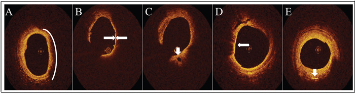 Figure 4: Representative OCT images. A. Lipid core (white arc) was defined as a diffusely bordered, signal-poor region. B. TCFA (white arrow) was defined as a lipid-rich plaque with fibrous cap thickness≤65μm. C. Micro-channel (white arrow) was defined as a black hole within a plaque with a diameter of 50-300μm and can be observed on at least 3 consecutive frames. D. Macrophages accumulation (white arrow) was a region with signal-rich, distinct or confluent punctuate heterogeneous backward shadows. E. Cholesterol crystal (white arrow) was defined as linear and highly backscattering structures within the lipid-rich plaques.