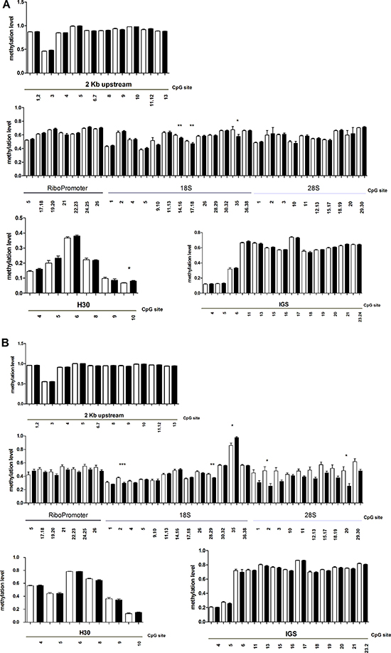 Figure 4: MassARRAY EpiTYPER analysis of KD (black-filled) and control cells (white-filled). (A and B) JHDM1B knock-down changes the methylation status of ribosomal genes: (A) MDA-MB-231 sh1-JHDM1B; (B) MCF 10A sh1-JHDM1B. Statistical analysis was by paired Student’s T-test *P < 0.05; **P < 0.01; ***P < 0.001, (N = 5, error bars, SEM).
