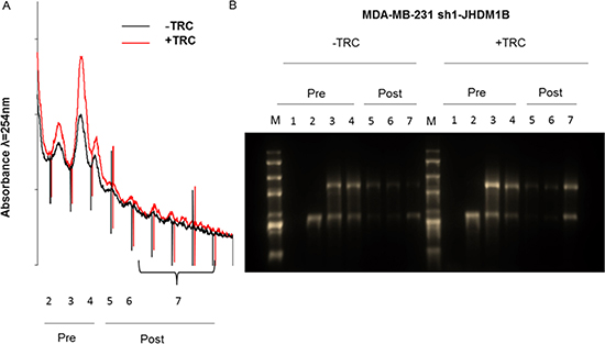 Figure 5: Polysome profile analysis of MDA-MB-231 sh1-JHDM1B cells. (A) Polysome profiles of control (black line) and KD cells (red line) obtained by measuring the absorbance at 254 nm in a continuous 15%–50% sucrose gradient. Numbers correspond to the sedimentation coefficients as follows: pre-polysomial 1) < 40 S; 2) 40 S; 3) 60 S; 4) 80 S, and post-polysomial > 80 5) disomes; 6) trisomes; and 7) the remaining polysome fractions. (B) Denaturing formaldehyde 1% agarose gel loaded with the total RNA extracted from each fraction obtained from the polysomal profile (M: 10000 bp RNA marker). Polysome profiles and gel are representative images of 3 independent experiments.