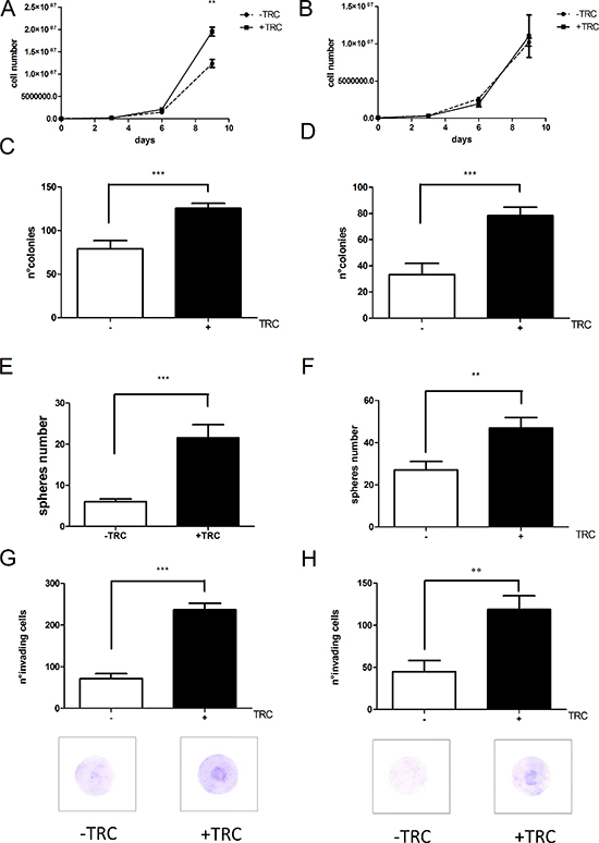 Figure 6: JHDM1B silencing triggers a more aggressive phenotype in the tested cell lines. (A) Growth curve profiles of control MDA-MB-231 sh1-JHDM1B cells (dotted line) and KD cells treated with TRC (solid line). (B) Growth curve profiles of control MCF 10A sh1-JHDM1B cells (dotted line) and KD cells (solid line) (N = 3, error bars, SEM). (C and D) Colony numbers obtained from (C) MDA-MB-231 sh1-JHDM1B and (D) MCF 10 A sh1-JHDM1B (N = 3, error bars, SEM). (E and F) Number of mammospheres produced by MDA-MB-231 sh1-JHDM1B (E) and MCF 10A sh1-JHDM1B (F). (G and H) Matrigel invasion assay of MDA-MB-231 sh1-JHDM1B (G) and MCF 10A sh1-JHDM1B (H). All graphs in the figure were obtained averaging at least three independent experiments (and no internal normalization between different experiments was performed), p values were obtained by unpaired Student’s T-test *P < 0.05; **P < 0.01; ***P < 0.001 (error bars, SEM). The images below provide a representative picture of the matrigel-coated filters after 16 h of invasion. Photographs of 5 different areas were acquired for each filter, at 10× magnification, and used for cell counts. (N = 6, error bars, SEM).