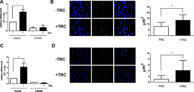 The level of newly synthesized 45S pre-rRNA was evaluated using the Click-iT Nascent RNA Capture Kit following the manufacturer’s specifications (Life Technologies). 3 × 105 cells were seeded in a 35 mm dish the day before the experiments. Cells were treated with 0.1 mM 5-ethynil uridine in culture medium for 1 h or 2 h (pulse), respectively, for MDA-MB-231 sh(1 or 2)-JHDM1B and MCF 10A sh(1 or 2)-JHDM1B. For the evaluation of 45S pre-rRNA processing, cells were cultured for 2 additional hours in the presence of an unmodified uridine excess at a concentration of 0.2 mM (chase).