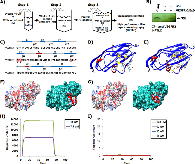 Figure 4: Binding of 3SL to the ExD of VEGFR-2. (A) Schematic presentation of the experimental procedure demonstrating the binding between sialyllactose and the extracellular domain of VEGFR-2. (B) Sialyllactose bound to the ExD of VEGFR-2 and the complex was immunoprecipitated using a VEGFR-2 specific antibody. After washing, sialyllactose was released and analyzed by HPTLC. Lane 1 indicates that the HPTLC loaded with SL as a loading control is developed with a resorcinol-hydrochloric acid reagent. (C) Sequence alignment and the secondary structure of the VEGFR-2 third IgG-like domain are shown. Secondary structure elements are indicated with the arrow (β-sheets) and rectangle (α-helix). The linker loops are shown as gray lines. Every ten residues are indicated by a bar. The interaction residues of 3SL and sialyl N-actetyllactosamine are indicated by red boxes and black stars, respectively. (D-E) Ribbon representations of the VEGFR-2 structure with 3SL or sialyl N-actetyllactosamine are shown. (F) Surface diagrams of VEGFR-2 with 3SL bound at the pocket (left: stick model, right: space filling shaped). Carbon atoms in gray, oxygen atoms in red, nitrogen atoms in blue, and sulfur atom in gold are shown. (G) Surface representation of VEGFR-2 with sialyl N-actetyllactosamine is shown. The interaction of (H) 3SL and (I) 3-sialyl N-actetyllactosamine with the 2-3 Ig-like domain of VEGFR-2 was measured using the Biocore assay.