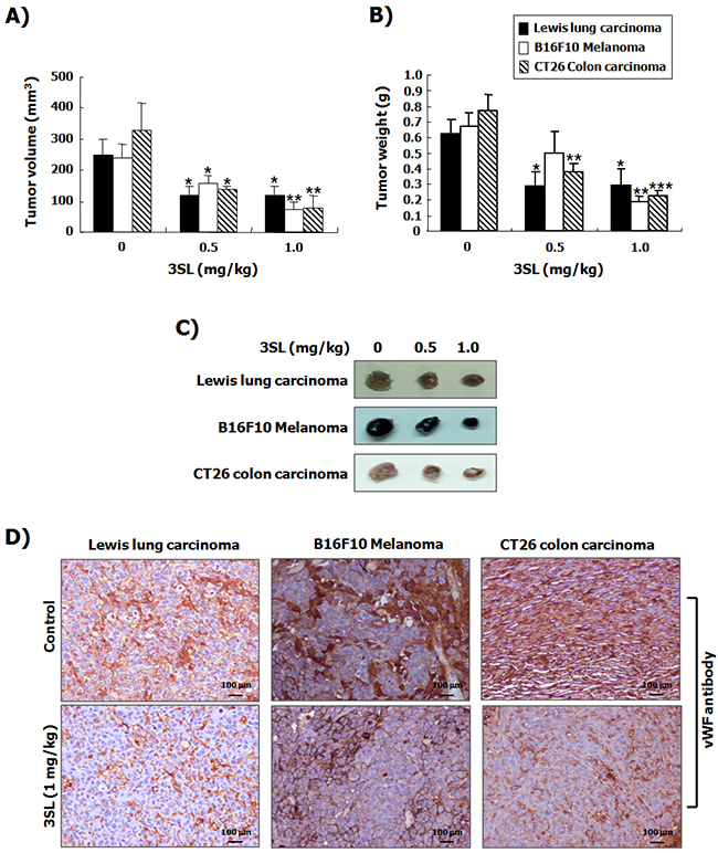 Figure 6: Suppression of tumor growth by sialyllactose in tumor-bearing mice. Lewis lung carcinoma cells (5 × 105 cells/100 μL in PBS), B16F10 melanoma cells (5 × 105 cells/100 μL in PBS), and CT26 colon carcinoma cells (5 × 105 cells /100 μL in PBS) were subcutaneously inoculated into the back of mice. Three days after inoculation, the indicated dosages of sialyllactose were intraperitoneally injected into mice daily. Tumor volume (A) and weight (B) were measured at the end of the experiment. The results are presented as the mean ± SD. * p<0.05, ** p<0.01 and *** p<0.001 compared to the control (1st lane). (C) Representative images of each tumor treated with the indicated dose of sialyllactose are shown. (D) Tumor tissues were immunostained with the vWF antibody to detect newly formed vessels on tumor tissues in mice inoculated with cancer cells.