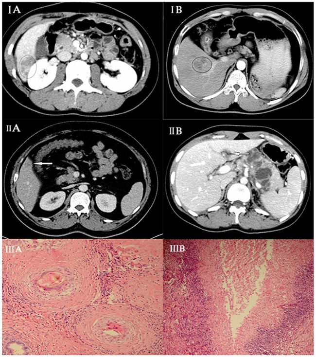 Figure 1: (IA) Hepatic paragonimiasis in a 50-year-old male patient. Enhanced MDCT scan at portal venous phase shows heterogeneous enhancement. (IB) Hepatocellular carcinoma in a 45-year-old female. Enhanced MDCT scan at portal venous phase shows homogeneous enhancement. (IIA) Hepatic paragonimiasis in a young male. Enhanced MDCT scan at portal venous phase shows solid, ring-enhancing with forming target loop as indicated by the arrow. (IIB) Image shows tubular formation in early phase of paragonimiasis as indicated by the arrow. (IIIA) Pathological finding showing an egg being engulfed by a macrophage with coagulative necrosis within the lesion surrounded by (IIIB) infiltration of a large number of barrier-like arrayed epithelioid cells.